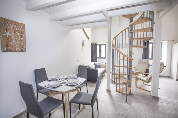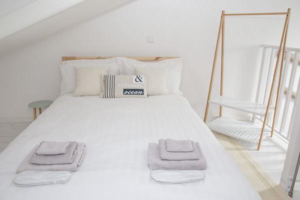 The lower level (1st floor) has tiled flooring whilst the mezzanine floor, kitchen and bathroom ceilings have whitewashed wood. The entire Suite is painted white with a soft approach to furnishings to create a calming beach-style effect.