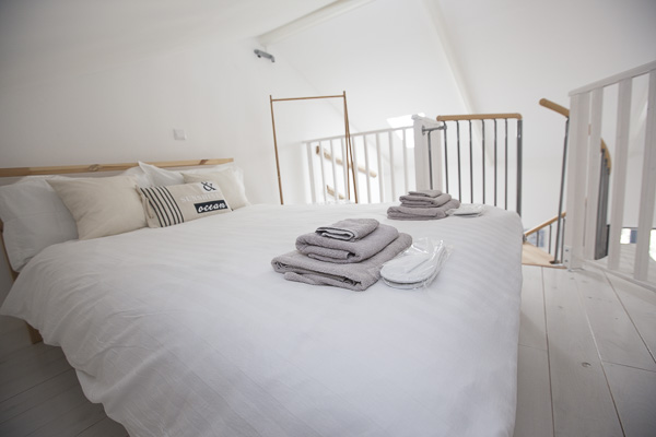 The lofty 2nd floor mezzanine bedroom has whitewashed wooden flooring, a double bed, hanging space, chest of drawers and bedside tables. A wardrobe is on the floor below.